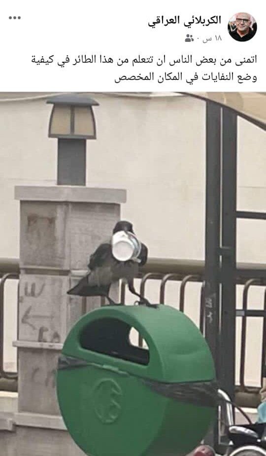 معاون خدمات شهری شهردار کربلا هنگام قدم زدن نزدیک میدان امام (ره) بود که صحنه جالبی نظر او را جلب کرد؛ او با مشاهده کلاغی که با گرفتن لیوان یکبار مصرف به نوک خود روی سطل زباله نشسته بود، عکس میگیرد و آن را فضای مجازی به اشتراک میگذارد.