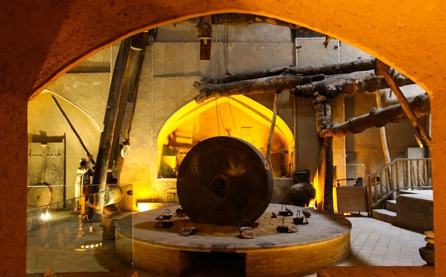 در موزه عصارخانه شاهی دو سنگ آسیاب در کنار هم قرار گرفته اند، کنار این سنگ آسیابها علاوه بر مجسمههایی از شتر و الاغ ،مجسمههایی از مردان عصار است تا نشانگر شیوه انجام کار آنها باشد.