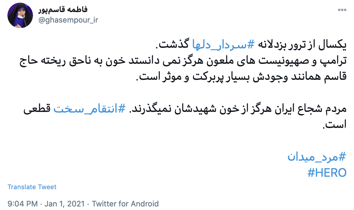 به گزارش خبرنگار ایمنا، فاطمه قاسم پور در صفحه توئیتر خود نوشت: یکسال از ترور بزدلانه سردار دلها گذشت. ترامپ و صهیونیستهای ملعون هرگز نمیدانستند خون به ناحق ریخته حاج قاسم همانند وجودش بسیار پربرکت و مؤثر است. مردم شجاع ایران هرگز از خون شهیدشان نمیگذرند. انتقام سخت قطعی است.