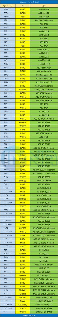 دانلود لیست قیمت گوشی‌های سامسونگ (فایل گرافیکی در اندازه اصلی)