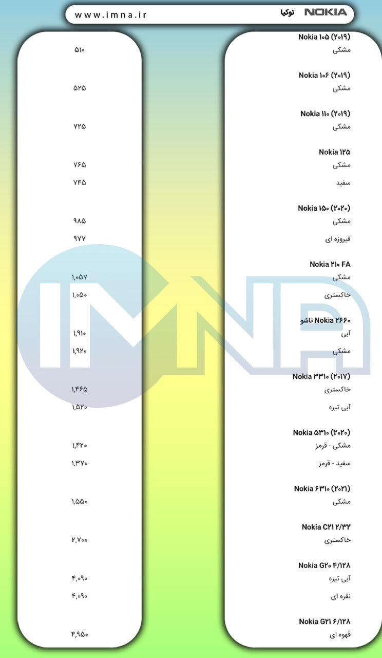 در ادامه لیست پرفروشترین مدلهای گوشی تلفن همراه برند نوکیا در بازه ۲۴ ساعت گذشته بازار ایران را به همراه قیمت حدودی آن مشاهده میکنید: