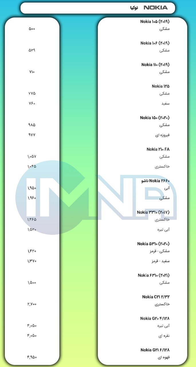 در ادامه لیست پرفروشترین مدلهای گوشی تلفن همراه برند نوکیا در بازه ۲۴ ساعت گذشته بازار ایران را به همراه قیمت حدودی آن مشاهده میکنید: