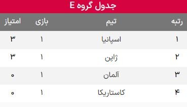 به گزارش خبرنگار ایمنا، گروه E جام جهانی ۲۰۲۲ قطر ملقب به «گروه مرگ» از تیمهای اسپانیا، کاستاریکا، آلمان و ژاپن تشکیل شده است که در روز سوم مسابقات جام ۲۰۲۲ تیمهای آلمان و ژاپن، اسپانیا و کاستاریکا وارد مستطیل سبز شدند. در دیداری هیجانانگیز تیم ژاپن مقابل آلمان به پیروزی رسید از سوی دیگر اسپانیا مقابل کاستاریکا پیروز شد.