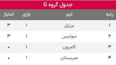 به گزارش خبرنگار ایمنا، در روز سوم مسابقات جام ۲۰۲۲ تیمهای سوئیس و کامرون، برزیل و صربستان وارد مستطیل سبز شدند. در دیدارهای این گروه سوئیس و برزیل به پیروزی رسیدند.