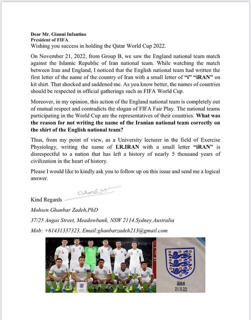 با آرزوی موفقیت در برگزاری مسابقات جام جهانی ۲۰۲۲ قطر، در تاریخ ۲۱ نوامبر ۲۰۲۲ از گروه B شاهد دیدار تیم ملی انگلیس مقابل تیم ملی جمهوری اسلامی ایران بودیم. هنگام تماشای بازی ایران و انگلیس متوجه شدم که روی پیراهن تیم ملی انگلیس حرف اول نام ایران با حروف کوچک نوشته شده است. این موضوع من را شوکه و غمگین کرد. همانطور که مستحضرید در مجامع رسمی مانند جام جهانی فوتبال باید به نام کشورها احترام گذاشت. ضمن اینکه به نظر من این اقدام تیم ملی انگلیس کاملاً از روی احترام متقابل نبوده و در تضاد با شعار بازی جوانمردانه فیفا است. تیمهای ملی شرکت کننده در جام جهانی نمایندگان کشورهای خود هستند.