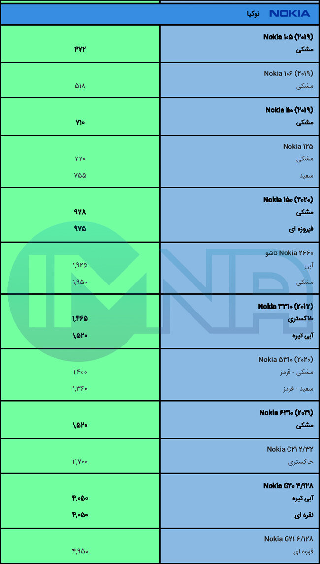 در ادامه لیست پرفروشترین مدلهای گوشی تلفن همراه برند نوکیا در بازه ۲۴ ساعت گذشته بازار ایران را به همراه قیمت حدودی آن مشاهده میکنید: