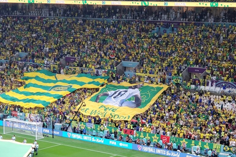 *بنر بزرگ پله قبل از شروع بازی توسط طرفداران برزیلی در سکوها به نمایش گذاشته شد که در روی با آرزوی سلامتی نوشته بود: به زودی خوب شو! اسطوره ۸۲ ساله روز پنجشنبه در بیمارستان بستری شده و شرایط مساعدی ندارد.