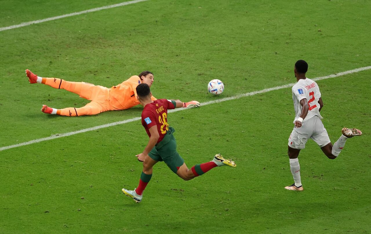 ۰-۱ (دقیقه ۱۷- پرتغال) - توپ ارسالی در محوطه جریمه سوئیس به گونسالو راموس رسید که او پس از کنترل توپ با ضربه ای ناگهانی و سهمگین با پای چپ طاق دروازه سوئیس را فرو ریخت.