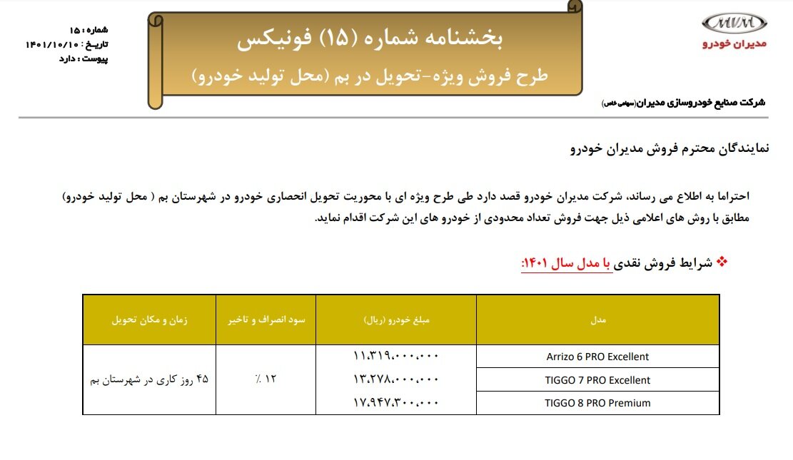 ۱۱) در صورت عدم مراجعه مشتری یا وکیل قانونی ایشان در اولین تاریخ اعلام شده توسط شرکت مدیران خودرو تمدید تاریخ تحویل در شهر بم تا دو مرتبه امکان پذیر خواهد بود و نهایتاً در صورت عدم مراجعه ایشان طی سه مرتبه اعلامی، خودروی مشتری در سال آینده (۱۴۰۲) در برنامه بارگیری قرار خواهد گرفت. بدیهی است مدل سال تولید خودرو در این شرایط تغییر نخواهد کرد.