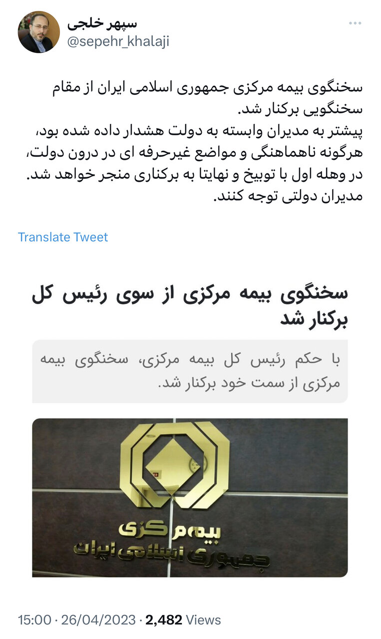 رئیس شورای اطلاعرسانی دولت درباره برکناری سخنگوی بیمه مرکزی نوشت: پیشتر به مدیران هشدار داده شده بود، هرگونه ناهماهنگی و مواضع غیرحرفه ای در درون دولت، در وهله اول با توبیخ و نهایتا به برکناری منجر خواهد شد.