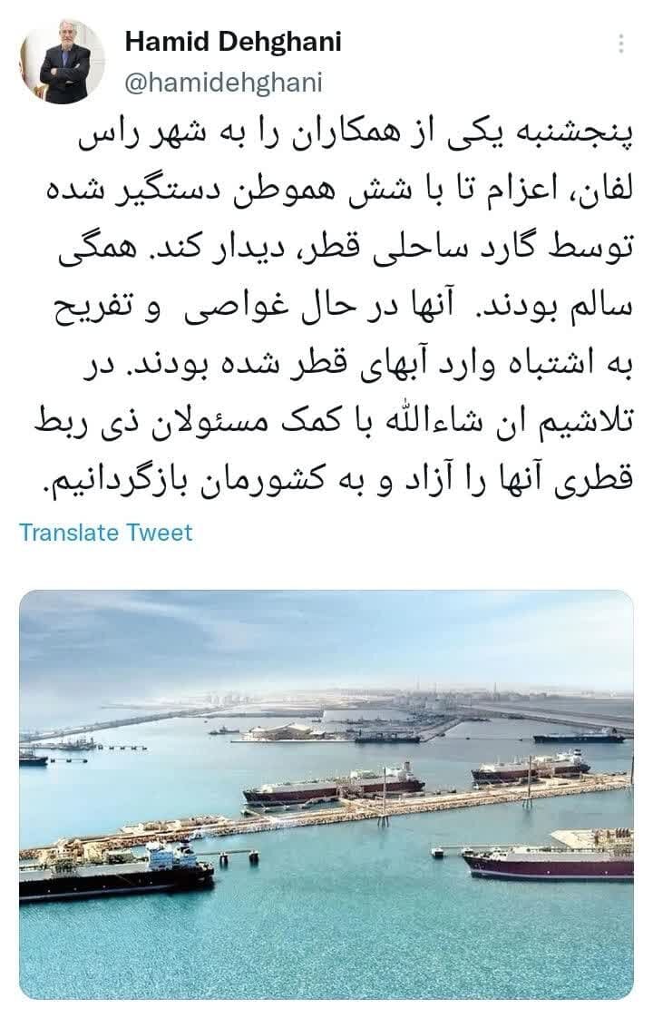 به گزارش ایمنا، حمید دهقانی امروز _سهشنبه بیستوششم اردیبهشتماه_ در صفحه توئیتر خود نوشت: پنجشنبه یکی از همکاران را به شهر رأس لفان اعزام کردیم تا با شش هموطن دستگیر شده توسط گارد ساحلی قطر دیدار کند.