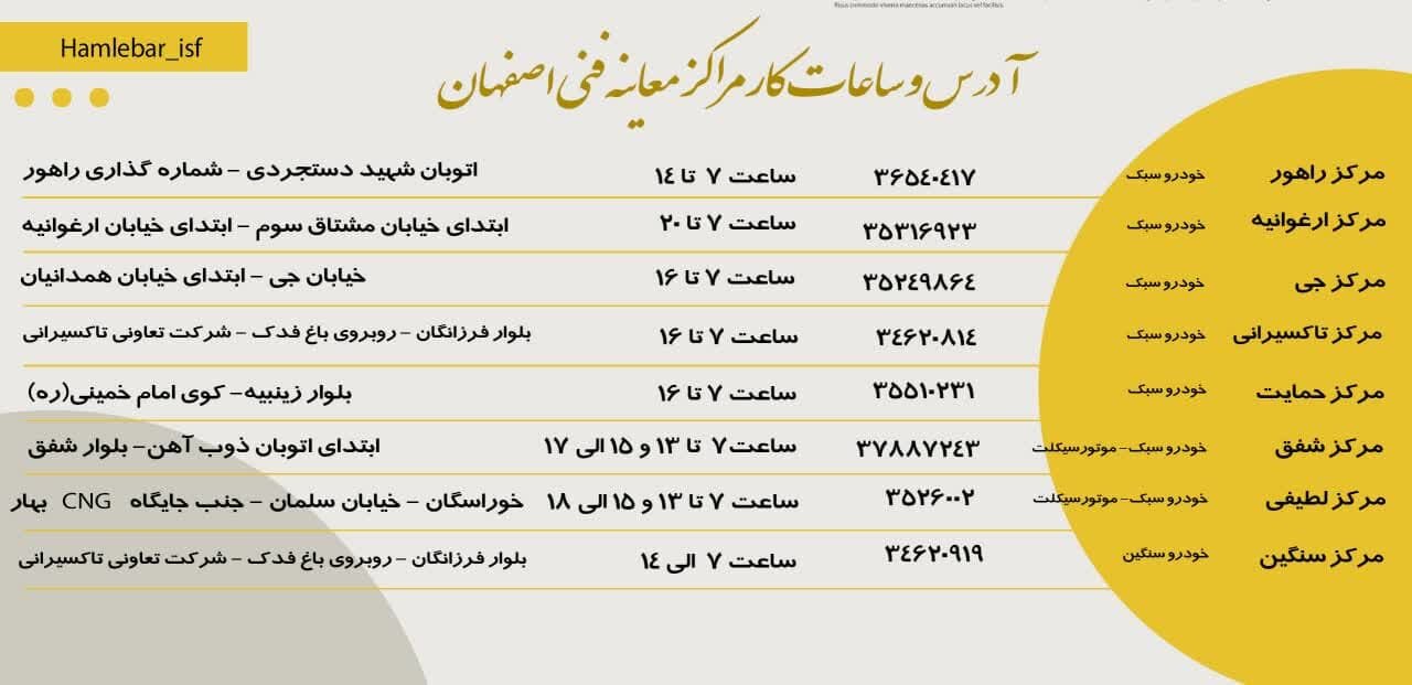 مدیرعامل سازمان مدیریت حملونقل بار شهرداری اصفهان تصریح کرد: بعضی مراکز معاینه فنی در دو نوبت صبح و عصر همچنین در روزهای جمعه آمادگی ارائه خدمات مربوطه را به شهروندان دارند، لذا شهروندان میتوانند با مراجعه به وبگاه http://isfahan.ir/hamlebar از ساعات فعالیت مراکز معاینه فنی مطلع شوند.