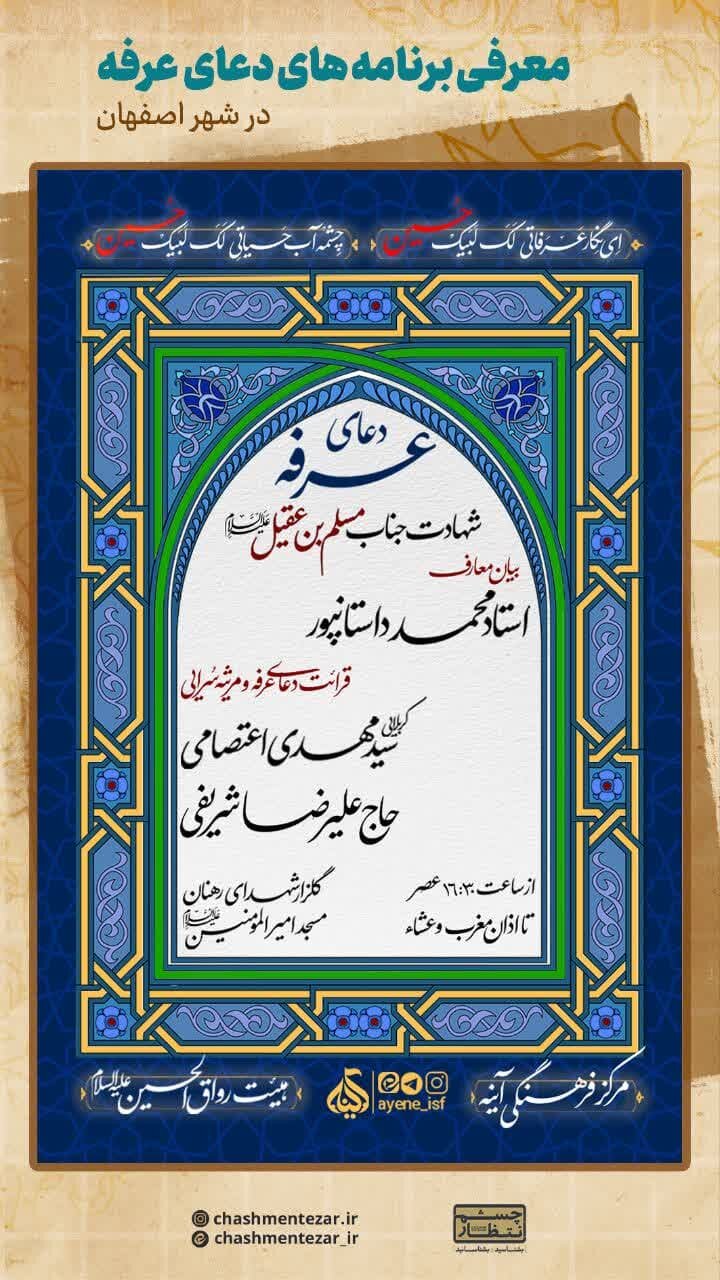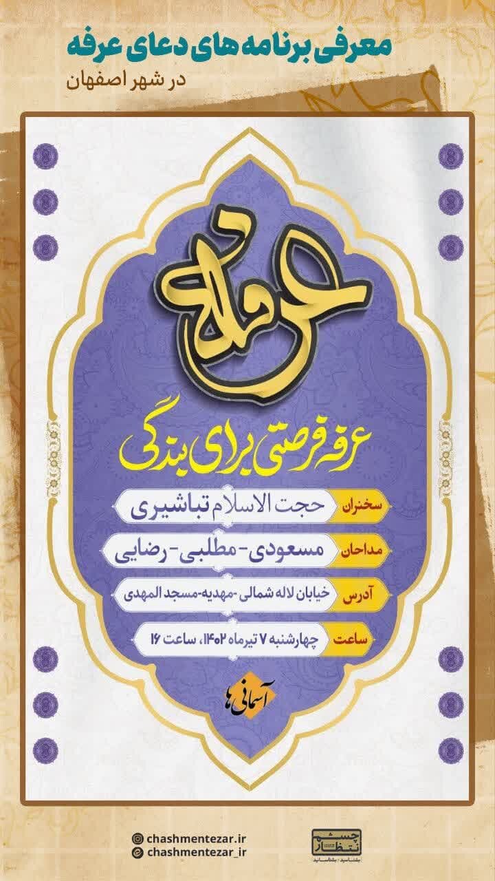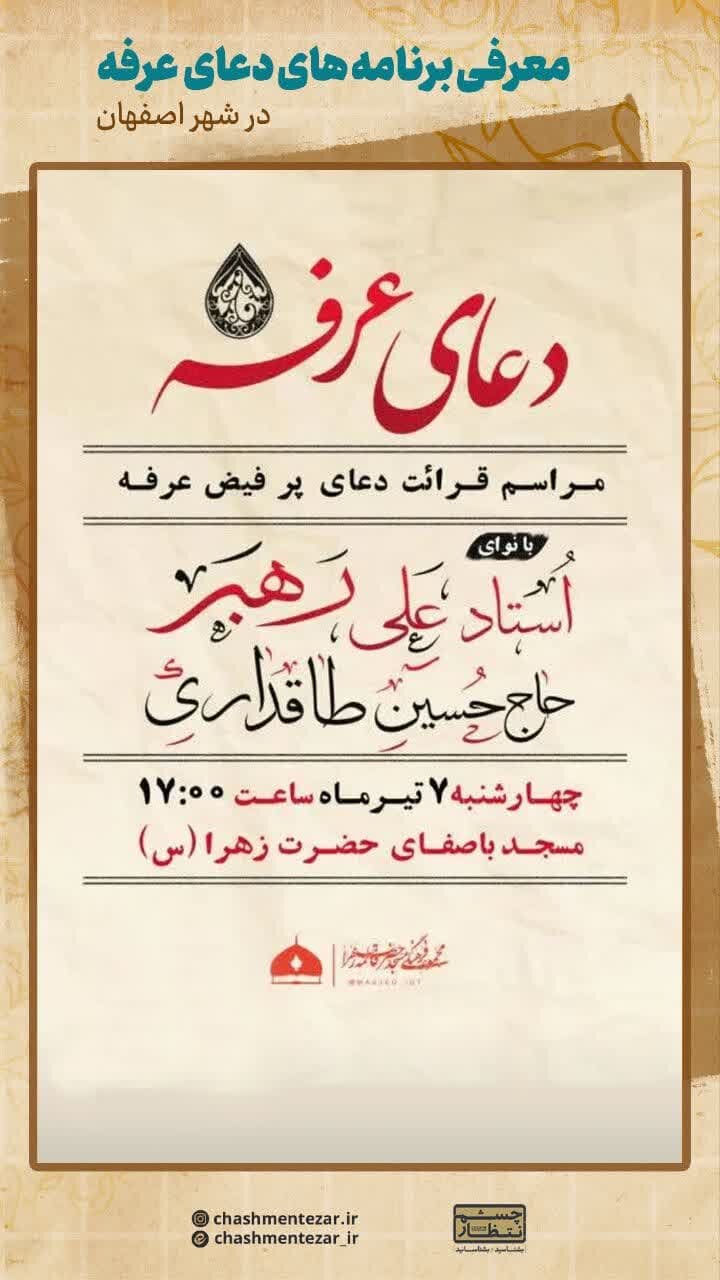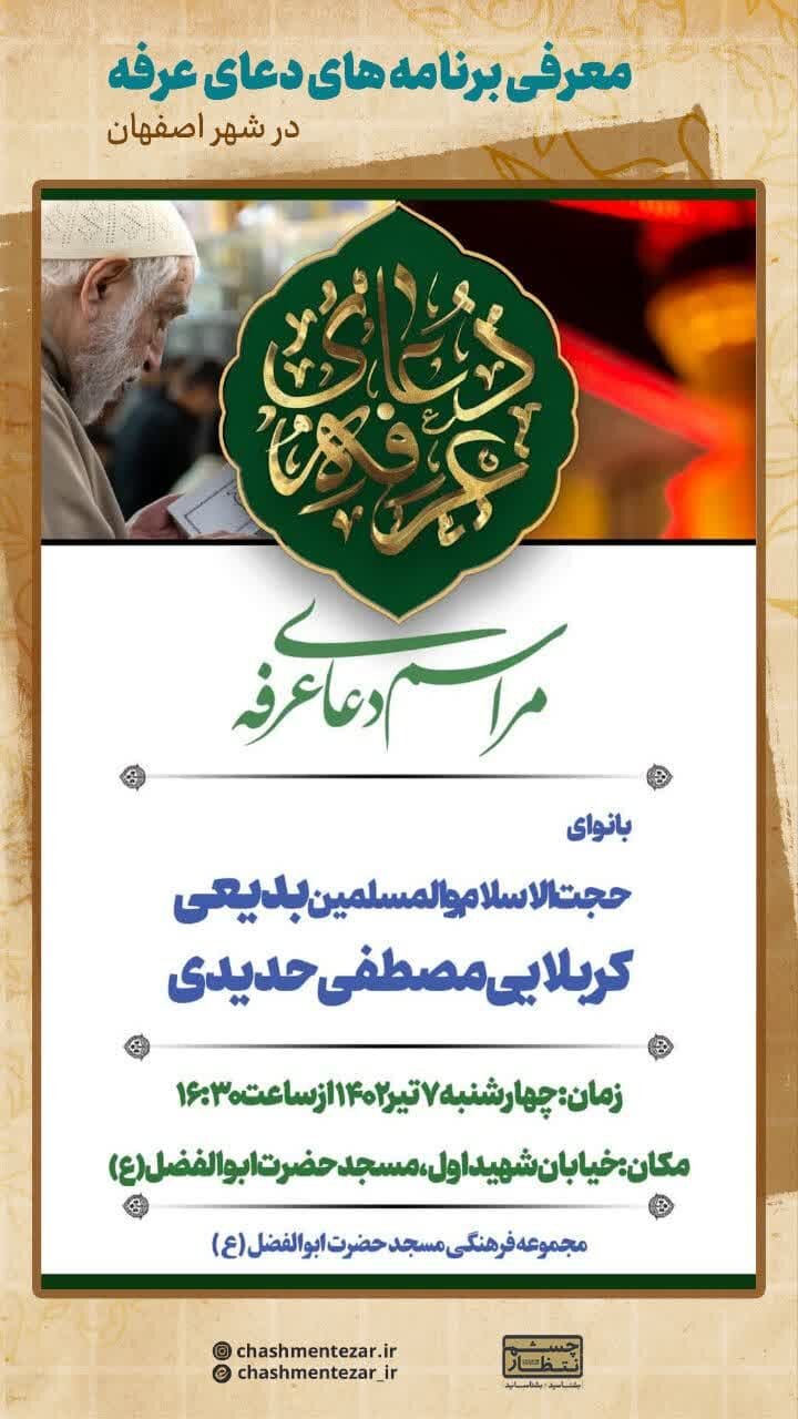 مدیرکل تبلیغات اسلامی استان اصفهان تصریح کرد: با فرارسیدن نهم ذیالحجه مراسم معنوی دعای عرفه امسال هم مانند سالهای گذشته در مناطق مختلف اصفهان برگزار میشود که برنامه برخی از مناطق اصفهان در این روزبه شرح زیر است: