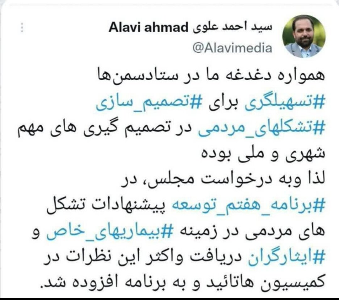 به گزارش خبرنگار ایمنا، سید احمد علوی در صفحه توئیتر خود از گنجاندن پیشنهادات تشکلهای مردمی در برنامه هفتم توسعه کشور خبر داد و نوشت: