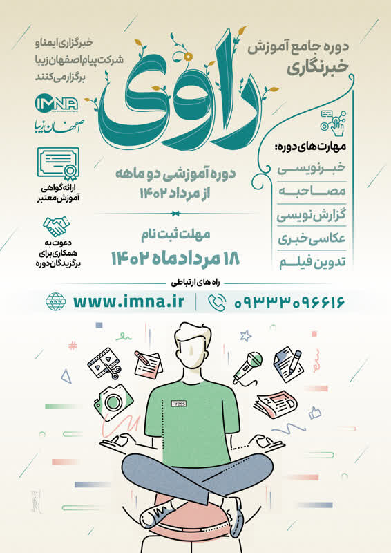 به گزارش خبرنگار ایمنا، دوره آموزشی دو ماهه خبرنگاری از سوی مدرسه ایمنا و آکادمی اصفهان زیبا در مرداد ۱۴۰۲ برگزار میشود.