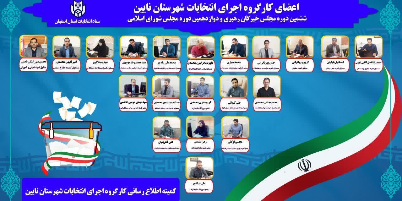 به گزارش ایمنا، مسئولان کمیته‌های تخصصی کارگروه اجرای انتخابات شهرستان نائین نیز آغاز به کار کرده‌اند. کمیته‌های فناوری و ثبت نام، حمل و نقل، حقوقی، حراست و استعلامات، اجرای انتخابات بخش انارک، دبیرخانه انتخابات، اطلاع رسانی، نظارت و تبلیغات انتخاباتی، اجرایی، مالی و پشتیبانی، مشارکت حداکثری و امنیت و آموزش، کمیته‌های تخصصی کارگروه اجرای انتخابات شهرستان نائین هستند.