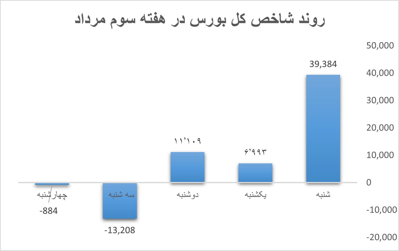 همچنین شاخص کل بورس در پایان معاملات روز دوشنبه با رشد ۱۱,۱۰۹ واحدی، به ۲,۰۵۱,۱۲۱ واحد رسید. از روز سهشنبه با قرمز شدن تابلو بورس، شاخص کل بورس در پایان معاملات با کاهش ۱۳, ۲۰۸ واحدی، به ۲,۰۳۷,۸۶۳ واحد رسید. در روز چهارشنبه نیز روند سرخ بورس ادامه داشت و شاخص کل با کاهش ۸۸۴.۴۴ واحدی، به ۲,۰۳۶,۹۸۵.۵۲ واحد رسید؛ همچنین ارزش معاملات خرد در آخرین روز بورس در این هفته نزدیک به رقم ۴,۱۹۹ میلیارد تومان اعلام شد.