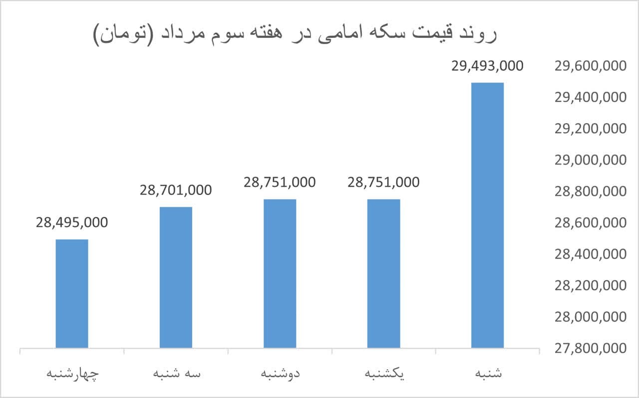 سکه امامی در اولین روز این هفته به قیمت ۲۹ میلیون ۴۹۳ هزار تومان در بازار خرید و فروش میشد. علاوه بر این قیمت هر گرم طلای ۱۸ عیار به دو میلیون و ۳۹۱ هزار و ۸۰۰ تومان رسید. بازار فلز زرد که توانست در برابر افزایش قیمت مقاومت کند با روند کاهشی همراه بود. برای مثال سکه امامی با ۹۹۸ هزار تومان کاهش قیمت یعنی چیزی در حدود ۳.۴۰ درصد کاهش به قیمت ۲۸ میلیون و ۴۹۵ هزار تومان رسید.