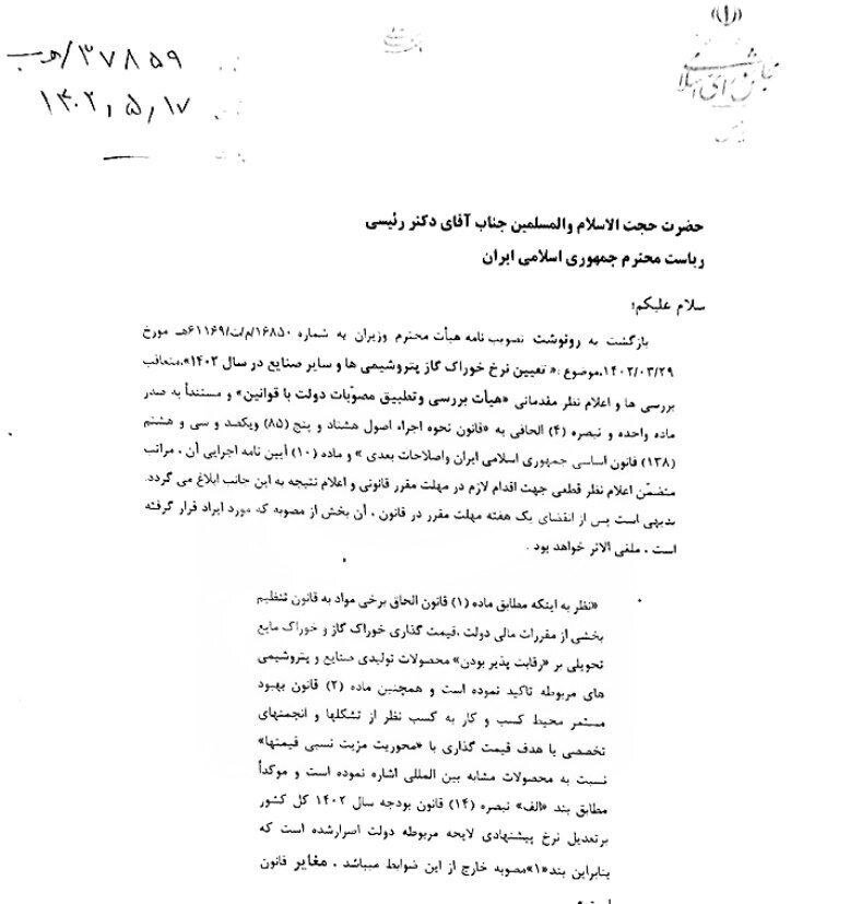 در این نامه تاکید شد، پس از انقضای مهلت یکهفتهای، آن بخش از مصوبه که مورد ایراد قرار گرفته است، ملغیالاثر خواهد بود.