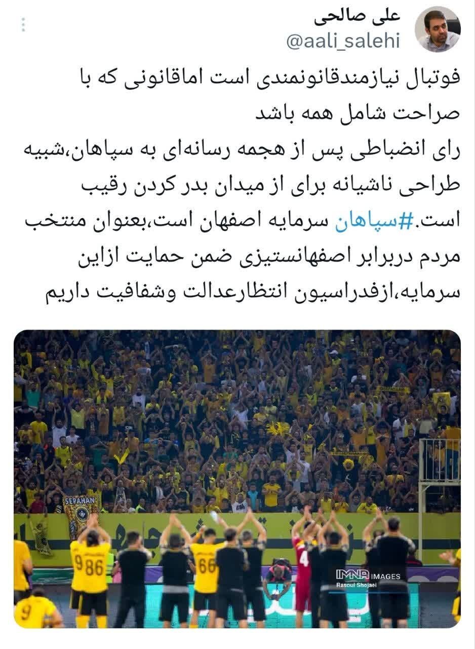 «فوتبال نیازمند قانونمندی است اما قانونی که با صراحت شامل همه باشد. رای انضباطی پس از هجمه رسانهای به سپاهان، شبیه طراحی ناشیانه برای از میدان بدر کردن رقیب است. سپاهان سرمایه اصفهان است، به عنوان منتخب مردم اصفهان در برابر اصفهان ستیزی صمن حمایت از این سرمایه از فدراسیون انتظار عدالت و شفافیت داریم»