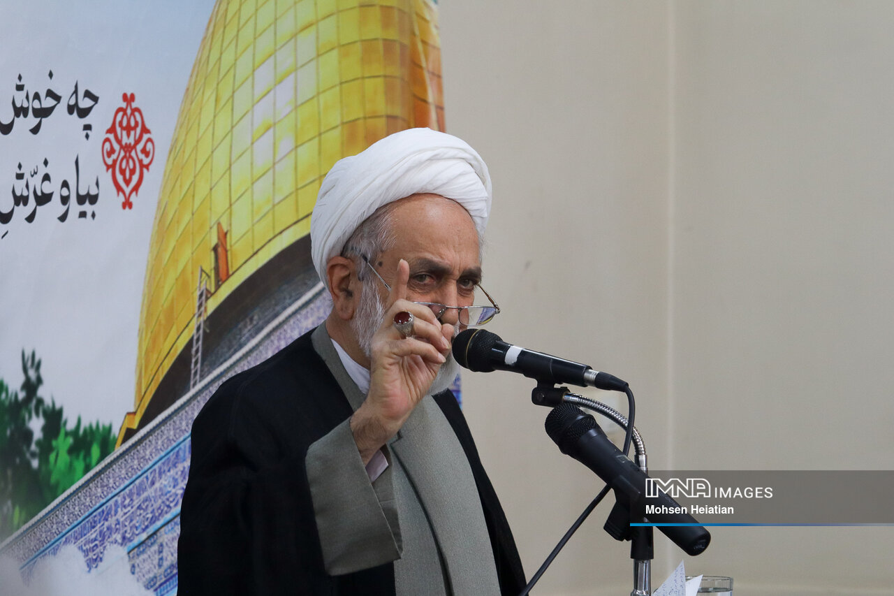 وی در ادامه و در حضور بزرگان حوزه علمیه اصفهان و سایر روحانیون و مبلغین خاطر نشان کرد: ای امام ما و ای فرمانده کل قوا اعلام آمادگی می‌کنیم که در هر گوشه از جهان در دفاع از اسلام و مظلومان همه ما آماده هستیم؛ اگر در زمان امیرالمومنین مردم زمان به فرمان او عمل نکردند امروز ما می‌گوییم که به فرمان علی زمان خود آماده حرکتیم؛ ملت ما انتظار فرمان دارد؛ اگر ساکت بنشینیم باید منتظر دشمن در پشت درب اتاق‌ها باشیم و عملیات ذلت را تحمل کنیم اما نیروهای مقاومت این ذلت را تبدیل به عزت کردند؛ نیروهای مقاومت با حکمت؛ تدبیر؛ مسلح شدن به سلاح‌های روز و با رعایت همه جوانب اطلاعاتی، امنیتی و طوفان به پاکردند و ما باید آن طوفان را تایید و اسرائیل غاصب را محکوم کنیم.