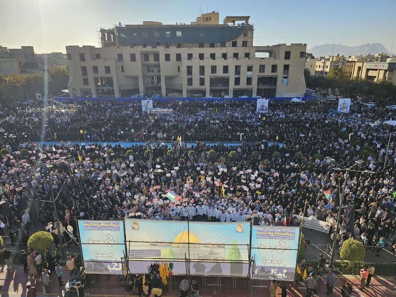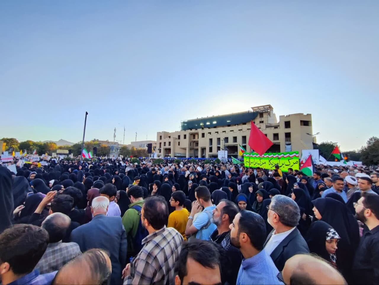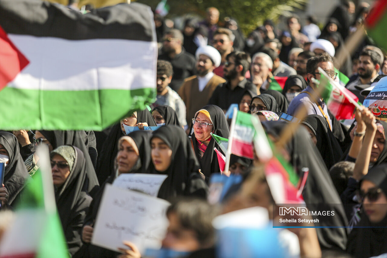 در تجمع امروز مردم اصفهان برای اعلام همبستگی و حمایت از فلسطین، از هر قشر و گروهی حضور دارند، از جوانان، دانشجویان و دانش آموزان گرفته تا پیرزن و پیرمردانی که هنوز طنین جمله «اسرائیل باید از صحنه روزگار محو شود» امام خمینی (ره) را از یاد نبرده بودند. جوانانی که میراث نفرت از صهیونیسم، سینه به سینه به آنها منتقل شده بود، حالا در کنار آنها که در این راه موی سفید کرده بودند، یکصدا فریاد «مرگ بر اسرائیل» و «مرگ بر آمریکا» سر میدادند.