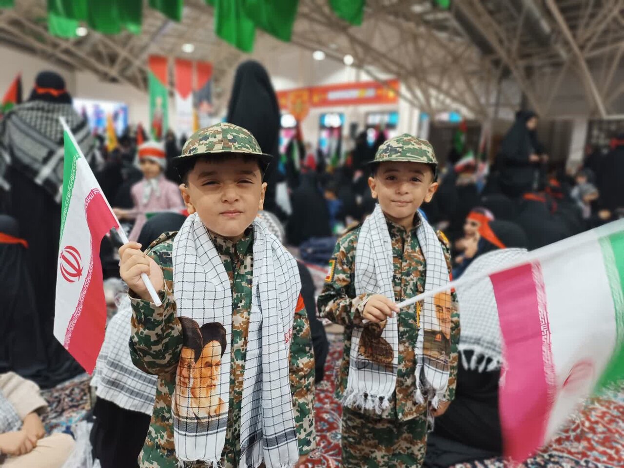 خانم امیری در حالی که فرزندان خود را با لباس رزم به صحنه آورده بود، میگوید: کودکان من علاقه زیادی به شهید حاج قاسم سلیمانی و شهدای مقاومت دارند و بنا به درخواست خودشان با این لباس آمده اند تا از بچههای فلسطینی حمایت کنند.