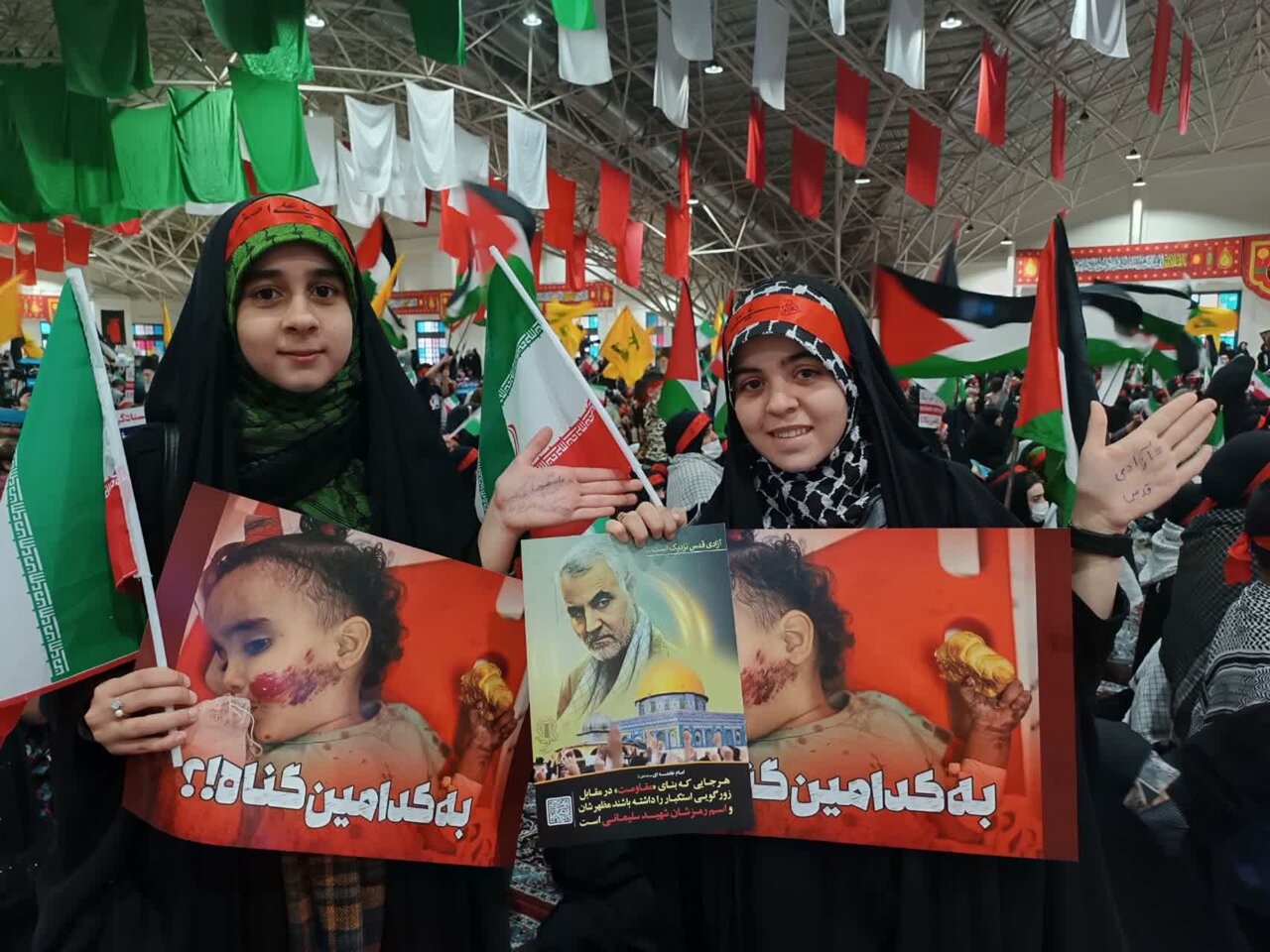 خانم بهاری که با دوقلوهای خود آمده بود میگوید: ما حمایت خود را از مردم به خصوص مادران و کودکان فلسطینی اعلام می کینم؛ بچههای من هم باید بدانند اسرائیل ظالم است، باید خود را آماده جهاد کنند و همه در برابر اسرائیل بایستیم.