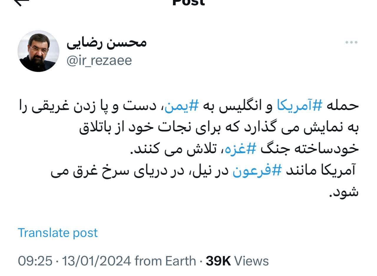 به گزارش خبرگزاری ایمنا، محسن رضایی در حساب کاربری خود در شبکه اجتماعی ایکس نوشت: حمله ‎آمریکا و انگلیس به ‎یمن، دست و پا زدن غریقی را به نمایش می‌گذارد که برای نجات خود از باتلاق خودساخته جنگ ‎غزه، تلاش می‌کنند. آمریکا مانند ‎فرعون در نیل، در دریای سرخ غرق می‌شود.