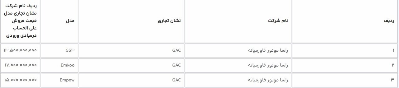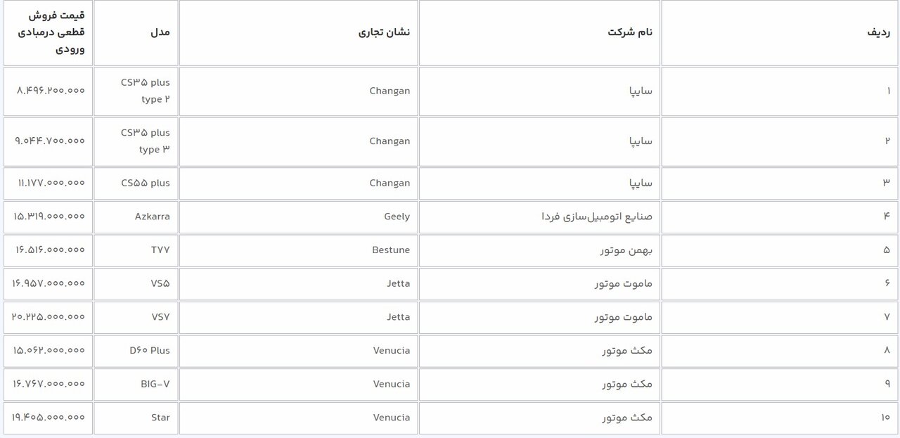 تبصره ۱- قیمت مندرج در جدول، قیمت قطعی در مبادی ورودی بوده و هزینه‌ها و عوارض قانونی پس از ترخیص از قبیل: بیمه شخص ثالث، مالیات بر ارزش افزوده، هزینه‌های شماره گذاری، اسقاط خودروی فرسوده کرایه حمل و … به قیمت‌های فوق اضافه می‌شود که واردکنندگان با رعایت آیین‌نامه اجرایی قانون حمایت از مصرف‌کنندگان خودرو می‌توانند نسبت به دریافت آن اقدام کرده و در موعد مقرر نسبت به تحویل خودرو اقدام کنند.