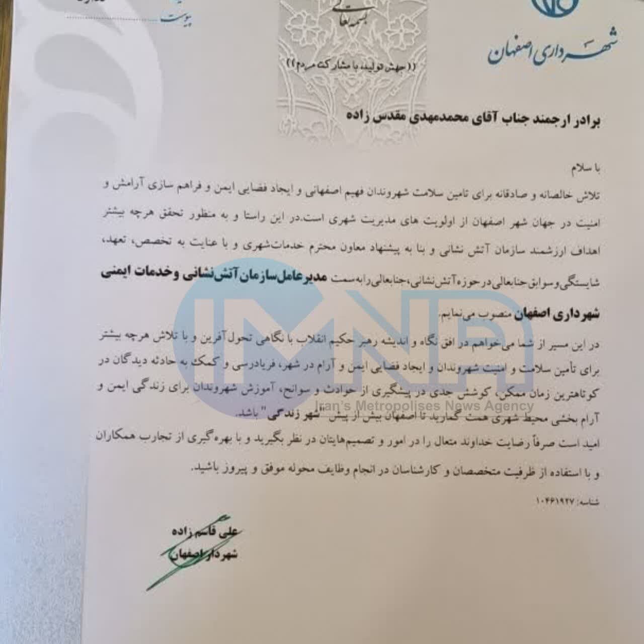 به گزارش خبرگزاری ایمنا، «علی قاسمزاده» با صدور حکمی، «محمدمهدی مقدسزاده» را به سمت مدیرعامل سازمان آتشنشانی و خدمات ایمنی شهرداری اصفهان منصوب کرد.