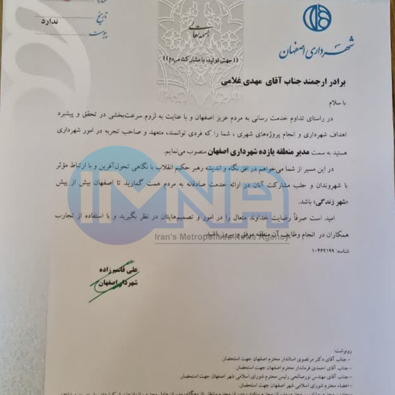 به گزارش خبرگزاری ایمنا، «علی قاسمزاده» شهردار اصفهان در حکمی مهدی غلامی را به عنوان مدیر منطقه ۱۱ شهرداری اصفهان منصوب کرد.