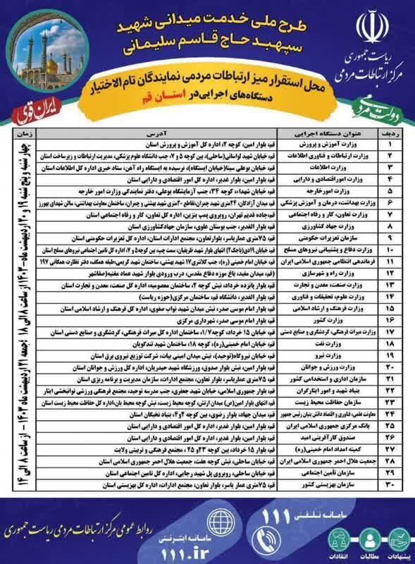 لیست کامل محل استقرار میز ارتباطات مردمی نمایندگان تامالاختیار وزارتخانهها و سازمانها برای پیگیری مطالبات و مشکلات مردم قم در تصویر زیر آمده است.