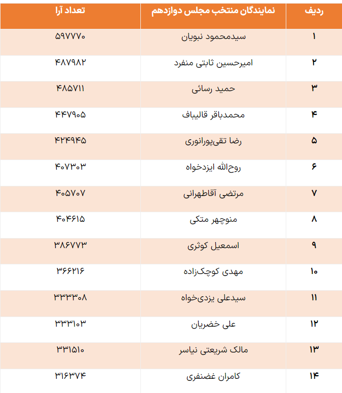 | ردیف | اسامی منتخبین | آرای ماخوذه |