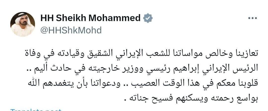 برای وزیر امور خارجه و دیگر همراهان ایشان طلب رحمت کرده و از این طریق به رهبر و مردم دوست و برادر ایران، دولت و خانوادۀ آقای رئیسی و همراهان ایشان مراتب تأسف خود را ابراز میدارم.
