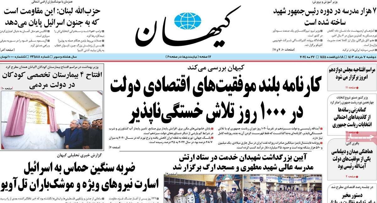 روزنامه کیهان در صفحه نخست امروز خود با تیتر «کارنامه بلند موفقیت‌های اقتصادی دولت در ۱۰۰۰ روز تلاش خستگی‌ناپذیر» نوشت: دغدغه اول و آخر شهید رئیسی خدمت به مردم با خنثی کردن اثر تحریم، اجرای طرح‌های کلان و بهبود معیشت مردم بود؛ از همین جهت تلاش شبانه‌روزی در دستور کار او و دولت سیزدهم بود. برخی دستاوردهای دولت سیزدهم برای مردم ملموس و بعضی غیرملموس است و درازمدت اثر آن نمایان می‌شود؛ اما آیت‌الله رئیسی و دولت او در تقریباً ۱۰۲۰ روز دوران ریاست جمهوری، با تلاش خستگی ناپذیر، کارنامه‌ای به جا گذاشت که فقط فهرست کردن آن به چند روزنامه کامل نیاز دارد.
