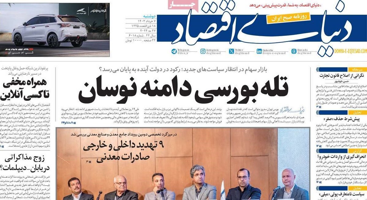 روزنامه دنیای اقتصاد در صفحه نخست امروز خود با تیتر «تله بورسی دامنه نوسان‌» نوشت: بورس تهران سه‌روز متوالی است که در تله دامنه نوسان گیر افتاده است. پس از شهادت رئیس‌جمهور و هیات همراه او، دامنه تحرکات بورس به ۲ درصد کاهش پیدا کرد. تداوم کاهش اجباری نوسانات بازار، سبب شد تا اهالی بازار سهام با هیجانات بیشتری دست به فروش بزنند. این درحالی است که ریسک تصمیمات ناگهانی نیز بر بازار سایه افکنده است. مجموعه این عوامل، سبب شده است تا دست بازارگردان برای کنترل بازار نیز بسته شود و صندوق‌های سهامی با وجود آنکه به نقدشوندگی بالا معروف هستند، با صف فروش مواجه شوند. به نظر می‌رسد شرایط ویژه‌ای که بورس با آن مواجه شده است طی ۱۹ روز معاملاتی آینده و تا انتخابات ریاست جمهوری ادامه یابد. انتظار می‌رود دولت جدید با کاهش دخالت‌های مستقیم خود در معاملات بورس تهران و سودآوری شرکت‌ها در صورت‌های مالی و همچنین حذف قیمت‌گذاری دستوری، بازار سرمایه را به روزهای رونق بازگرداند.