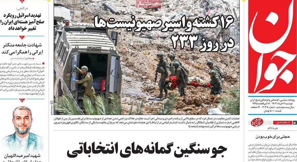 روزنامه جوان در صفحه نخست امروز خود با تیتر «جو سنگین گمانه‌های انتخاباتی» نوشت: تب انتخابات داغ شد. سه روز دیگر ثبت‌نام‌ها آغاز می‌شود و ۳۰ روز دیگر خود انتخابات برگزار خواهد شد. اکنون جو سنگینی در فضای رسانه‌ها و فضای ذهنی مردم حاکم شده است: چه کسی نهمین رئیس‌جمهور ایران می‌شود؟ برخی مانند غلامحسین اژه‌ای رسماً اعلام کردند که در این انتخابات نامزد نخواهند شد. برخی دیگر که کمتر شناخته شده هستند، از همین حالا اعلام حضور کرده‌اند تا از حداکثر زمان برای شناساندن خودشان استفاده کنند.