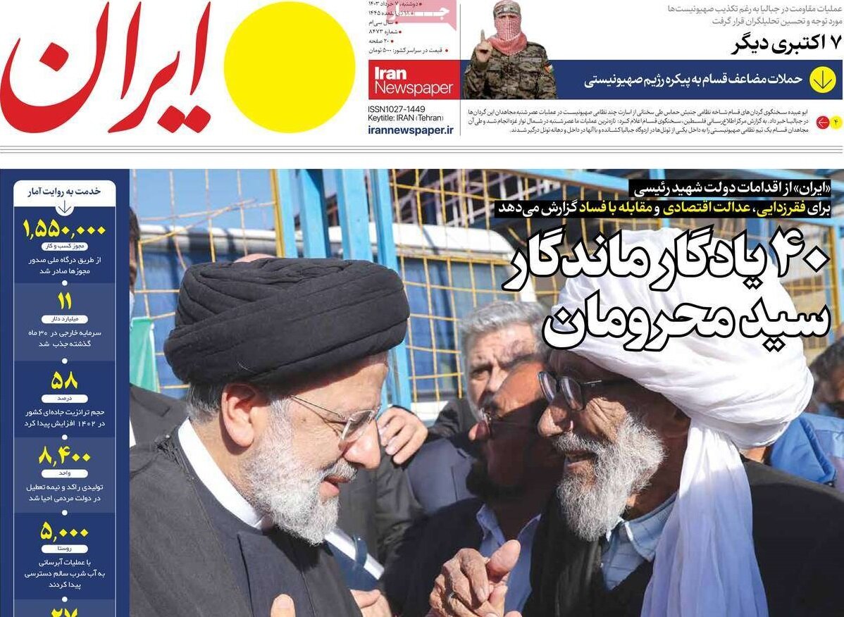 روزنامه ایران در صفحه نخست امروز خود با تیتر «۴۰ یادگار ماندگار سید محرومان‌» نوشت: دولت با ریاست «شهید جمهور» از همان ابتدای روی کار آمدن در نیمه گرم تابستان پرالتهاب سال ۱۴۰۰ به دلیل همه‌گیری کرونا و فرو رفتن در باتلاق برجام؛ با رکود اقتصادی، رشد فقر و افزایش شکاف طبقاتی مواجه بود؛ گزاره‌هایی که برای هر دولتی می‌توانست یک بحران و شاید هم موجب زمینگیر شدن آن دولت می‌شد، اما این دولت با مدیریت کارآمد شهید آیت‌الله ابراهیم رئیسی، گام به گام همه این بحران‌ها را پشت سر گذاشت.