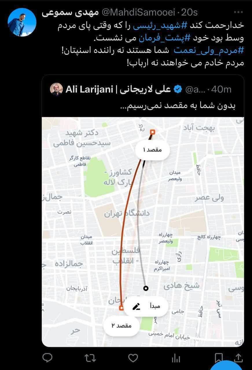 مهدی سموعی مدیر کل روابط عمومی وزارت فرهنگ. و ارشاد اسلامی هم نوشت: «خدا رحمت کند شهید رئیسی را که وقتی پای مردم وسط بود خوود پشت فرمان مینشست.«