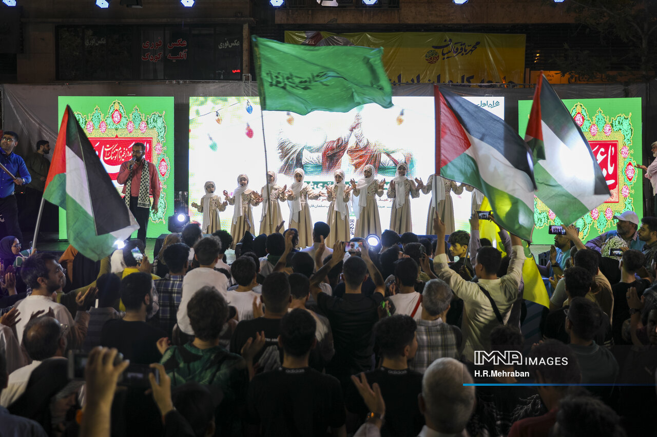 ساعت ۲۲ است، اما همچنان مشتاقان امیرالمؤمنین علیهالسلام همچنان با شور و شیاق در مراسم مهمانی کیلومتری غدیر حضور دارند. تمام میادین شهر را انبوه جمعیت فرا گرفته است. رضا هلالی همراه با محمدرضا توشهور به اجرای نماهنگ مشغولند و استقبالکنندگان این برنامه را اکثراً کودکان و نوجوان شکل میدهند.