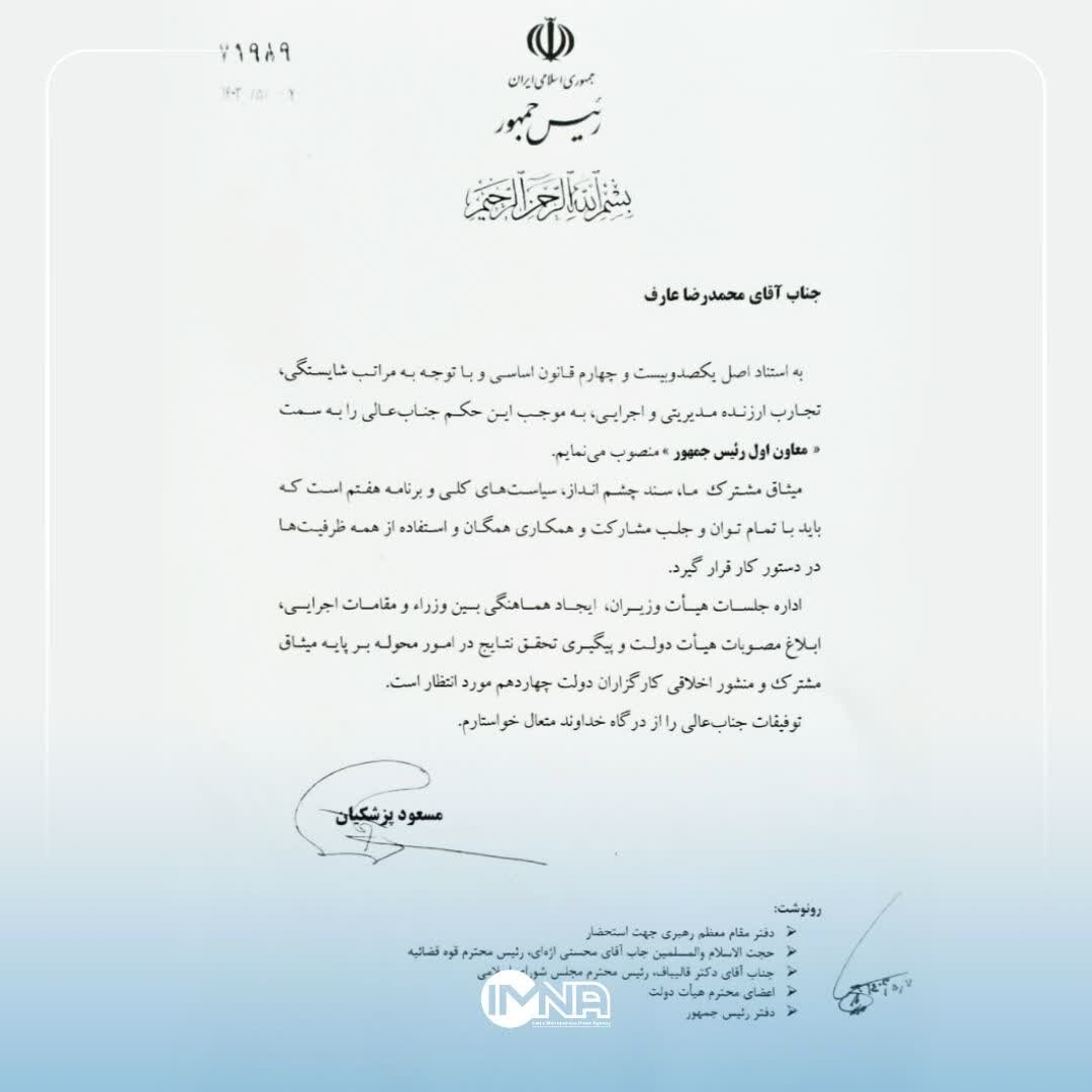به گزارش خبرگزاری ایمنا، مسعود پزشکیان در حکمی محمدرضا عارف را به عنوان معاون اول رئیسجمهور منصوب کرد.