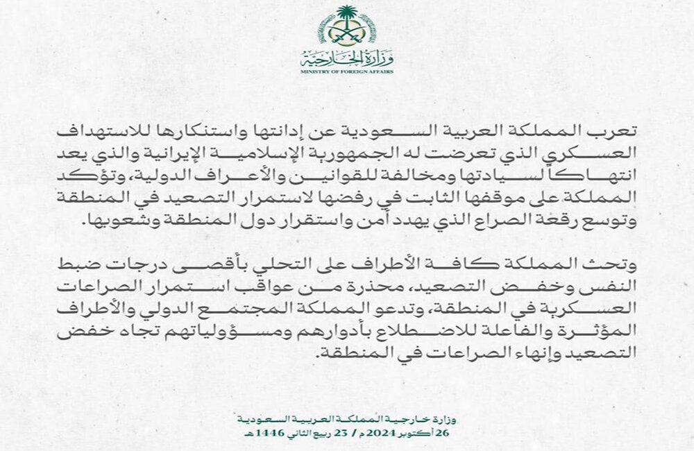 بر اساس این گزارش، وزارت خارجه عربستان اعلام کرد: ما حمله نظامی به ایران را محکوم میکنیم.