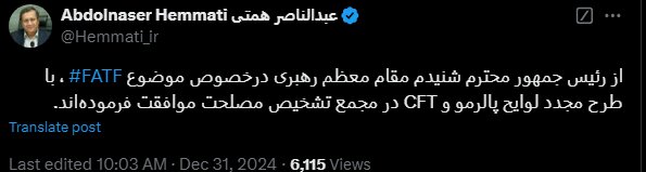 به گزارش خبرگزاری ایمنا، «عبدالناصر همتی» در فضای مجازی نوشت: «از رئیس جمهور محترم شنیدم مقام معظم رهبری درخصوص موضوع FATF، با طرح مجدد لوایح پالرمو و CFT در مجمع تشخیص مصلحت موافقت فرمودهاند.»