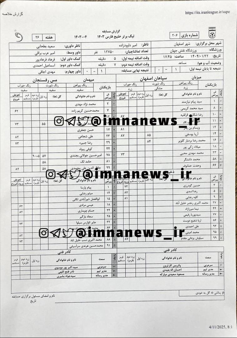 به گزارش خبرگزاری ایمنا، امشب _جمعه بیستودوم فروردین_ دو تیم سپاهان و مس رفسنجان در چهارچوب رقابتهای لیگ برتر فوتبال جام خلیج فارس به مصاف یکدیگر رفتند که این دیدار با نتیجه یک بر صفر به سود زردپوشان اصفهانی به پایان رسید.