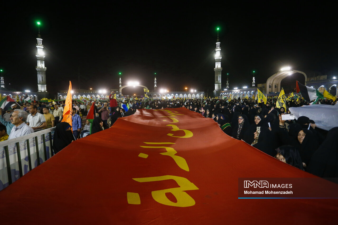 در این اجتماع دریایی از پرچمهای فلسطین و حزبالله به دست زنان، مردان، پیر و جوان، فضایی سراسر حماسی و انقلابی را خلق کرده بود، چشمها نمناک و غمگین از ظلمی که به امت اسلامی روا داشته میشود بود و لبها حماسیترین شعارها را سر داد.