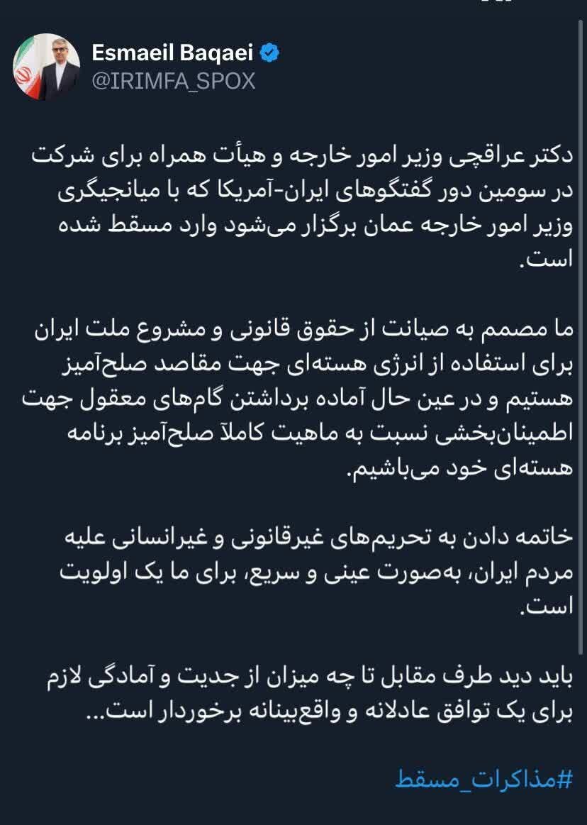 به گزارش خبرگزاری ایمنا، اسماعیل بقایی همزمان با حضور هیئت مذاکره کننده ایران در مسقط پایتخت عمان در حساب کاربری خود در شبکه ایکس نوشت: «دکتر عراقچی وزیر امور خارجه و هیئت همراه برای شرکت در سومین دور گفتگوهای ایران-آمریکا که با میانجیگری وزیر امور خارجه عمان برگزار میشود وارد مسقط شده است.