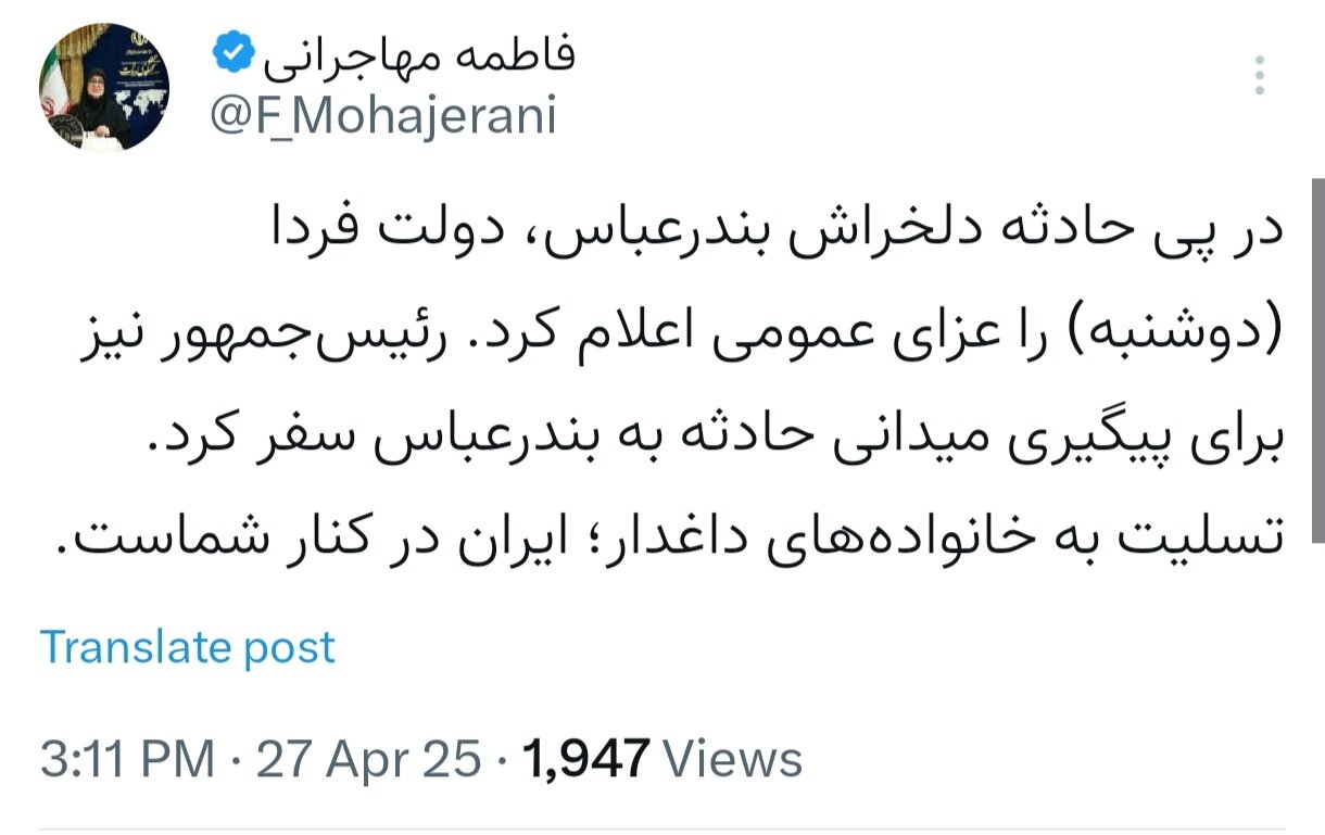 به گزارش خبرگزاری ایمنا، فاطمه مهاجرانی سخنگوی دولت امروز _یکشنبه هفتم اردیبهشت_ در حساب کاربری خود در شبکه اجتماعی ایکس نوشت: «به دنبال حادثه ناگوار در بندر شهید رجایی بندرعباس، دولت چهاردهم فردا را در سراسر کشور عزای عمومی اعلام کرد. رئیس جمهور نیز برای پیگیری میدانی حادثه به بندرعباس سفر کرد. تسلیت به خانوادههای داغدار؛ ایران در کنار شماست».
