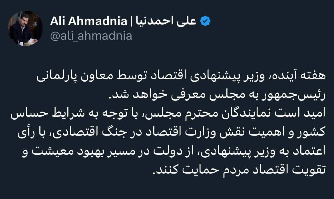 به گزارش خبرگزاری ایمنا و به نقل از پایگاه اطلاعرسانی دولت، علی احمدنیا، در حساب کاربری خود در شبکه ایکس نوشت: «هفته آینده، وزیر پیشنهادی اقتصاد توسط معاون پارلمانی رئیسجمهور به مجلس معرفی خواهد شد.