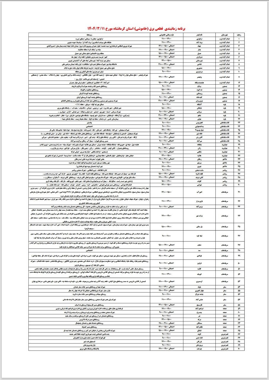 شرکت توزیع برق استان کرمانشاه زمانبندی قطعی برق برای مناطق مختلف را در روز یکشنبه اعلام کرد.